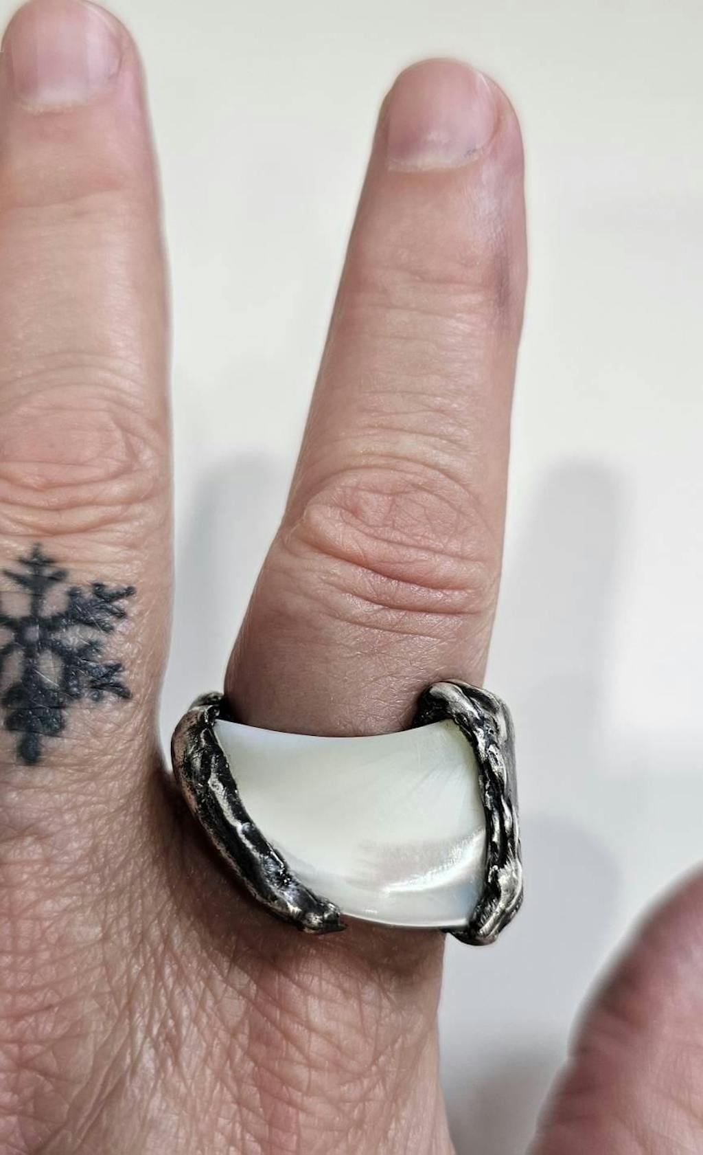 This ring is made with a natural piece of mother of pearl, set in oxidized sterling silver. We kept the shape a bit rough and imperfect, so it feels more real, more handmade.